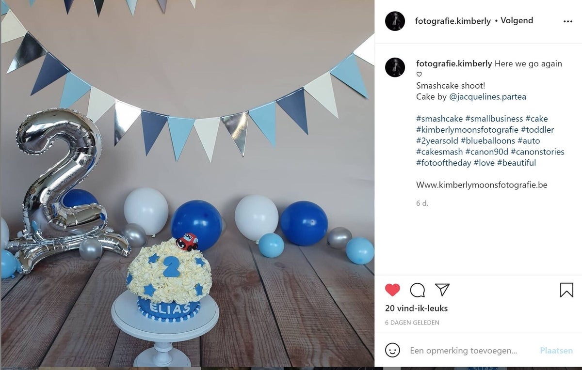 Is je kleine kapoen binnenkort jarig en maakt hij of zij graag zijn handen vuil dan is deze smash cake de ideale "taart" waarop je peuter zich naar hartelust kan uitleven. Je kan de basic smash cake naar kleur bestellen met een topping van creme au beurre €30. Wens je deze iets meer gepimpt ( vlindertjes, bloemen.....) €32. Indien je er nog een geboetseerd figuurtje erbij wenst €34. Wens je daar een Top fotoreportage erbij dan kan je contact opnemen met Kimberly Moons Fotografie